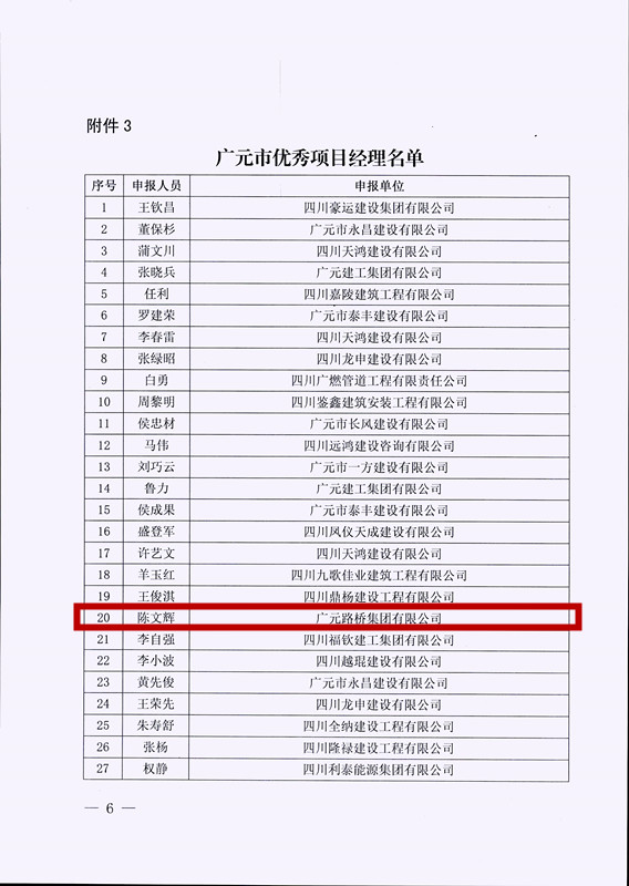 2023年7月1日,廣元路橋集團有限公司被廣元市住房和城鄉(xiāng)建設(shè)局評為優(yōu)秀建筑企業(yè);陳文輝被評為“廣元市優(yōu)秀項目經(jīng)理”;母健全、楊琳容被評為“廣元市優(yōu)秀技術(shù)負責人”。